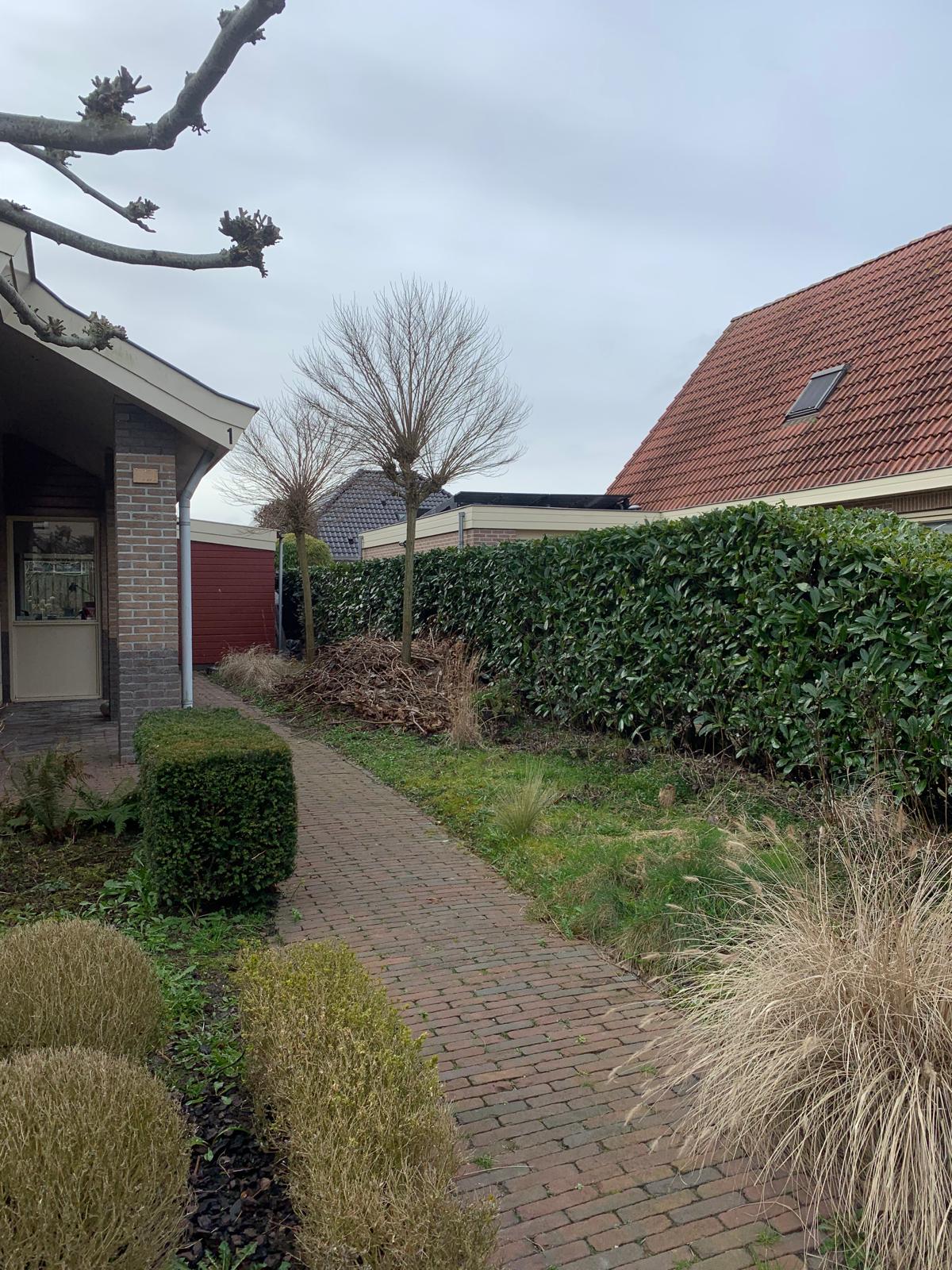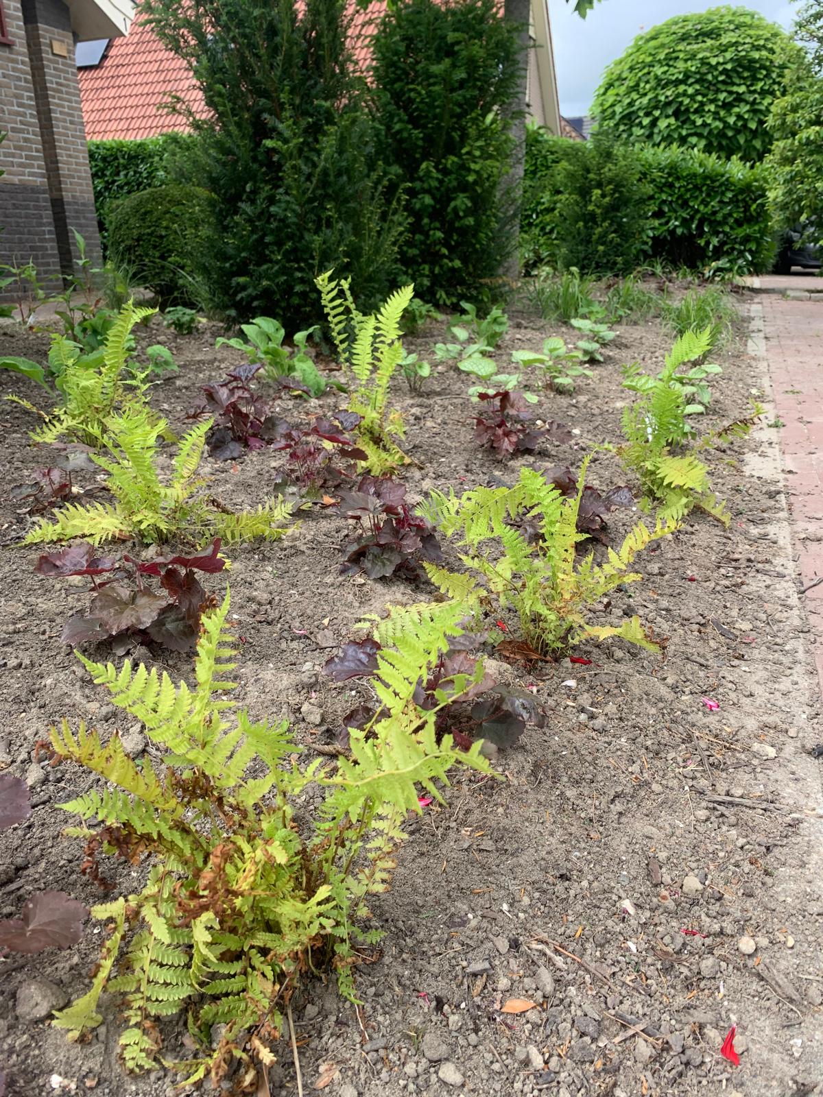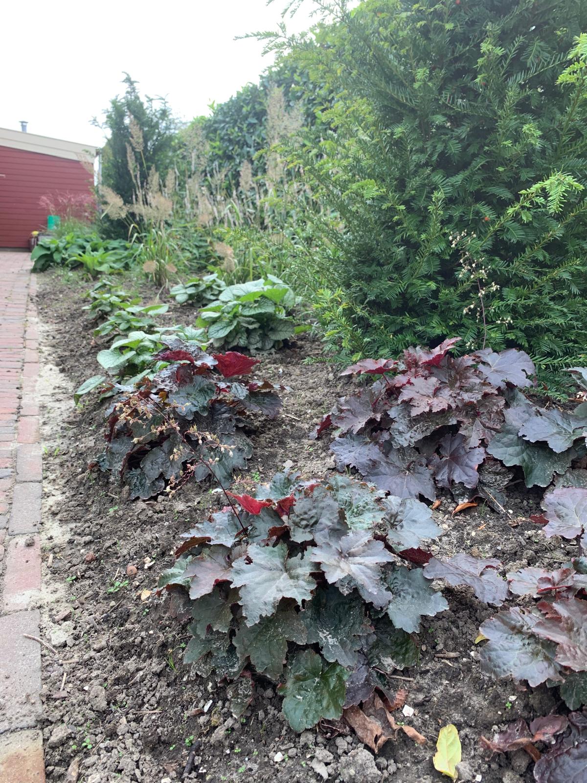 Is een schaduwtuin lastig? Zeker niet met de juiste beplanting! Voor deze voortuin in Middenmeer hebben we taxuszuilen geplaatst voor structuur en hoogte, gecombineerd met bladplanten zoals Brunnera Jack Frost, die een prachtig bladpatroon biedt en goed gedijt in schaduw. De purperkleurige Heuchera verbindt de tuin mooi met de verf van het huis, terwijl Miscanthus sinensis ‘Red Chief’ beweging en textuur toevoegt.